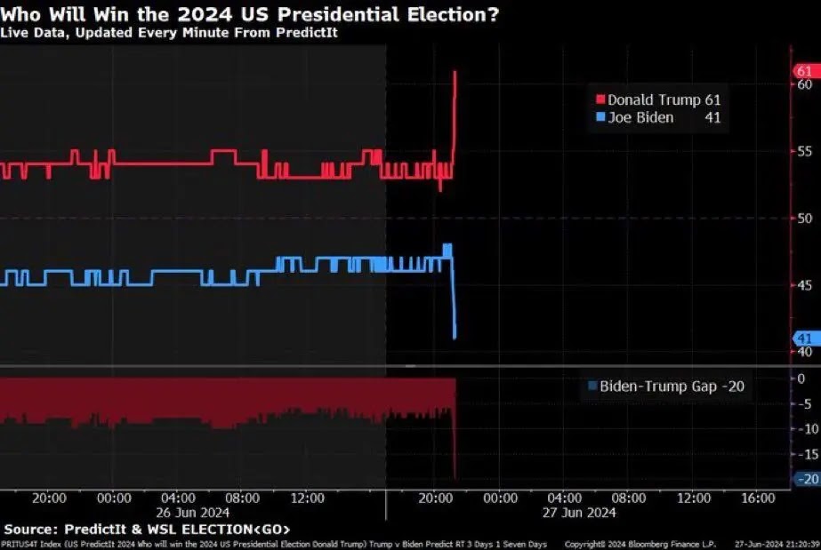 Os dados do site PredictIt mostram como, durante o debate, as chances de Trump subiram rapidamente, enquanto as de Biden despencaram para 40%.